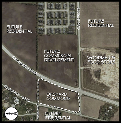 Orchard Commons is a 12.5 acre Richmar Realty development located at the northwest corner of Orchard Road and Oak Street, approximately one mile north of the I-88 Orchard Road exchange. This property has approximately 1,100 Lin. Ft. frontage exposure along Orchard and Deerpath as well as approximately 500 Lin. Ft. along Oak and Tanner extended.